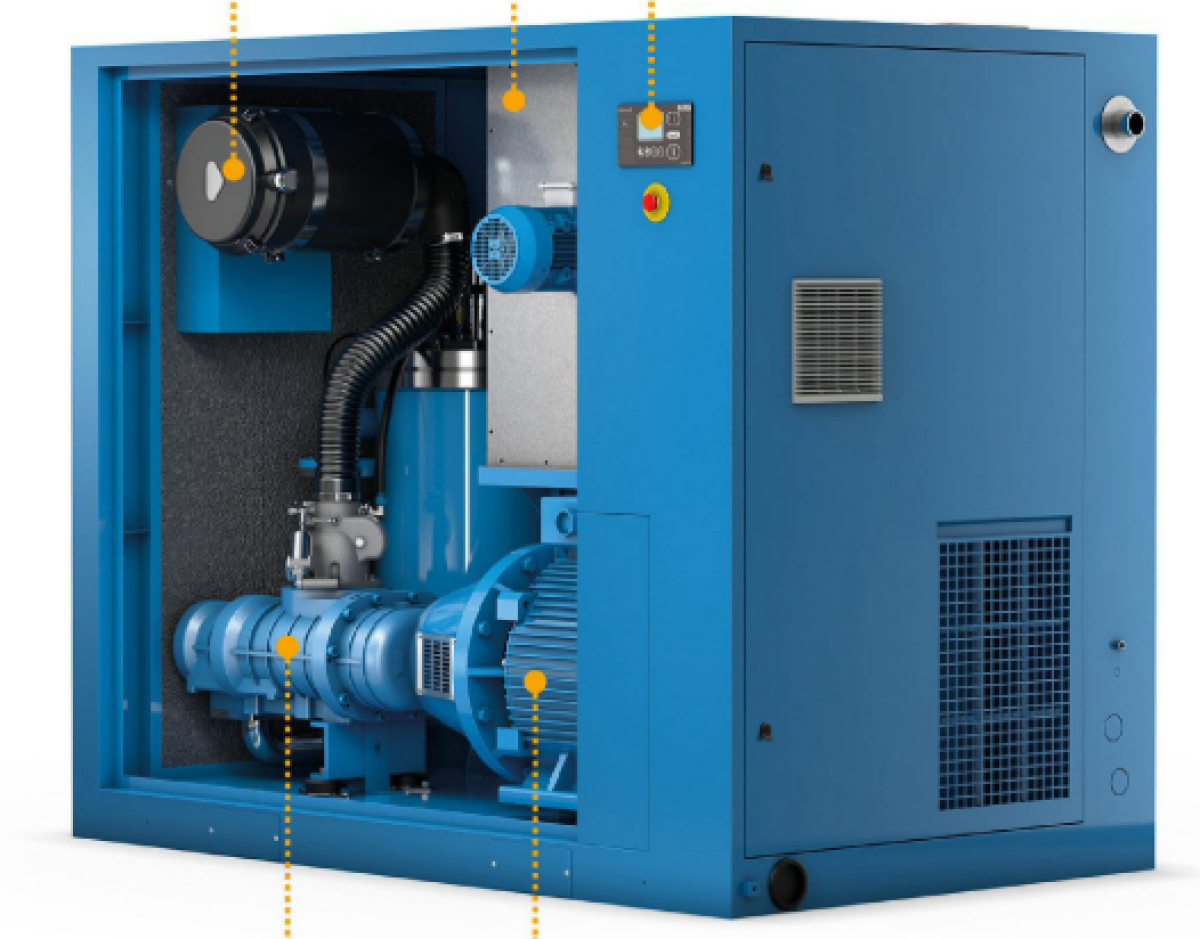 Kompressor on sagedusmuunduriga ja otseülekandega, tänu millele on ta tavalistest kruvikompressoritest kuni 35% energia säästlikum. Tänu sagedusmuundurile toodab kompressor õhku täpselt nii palju kui tarbitakse, on sujuvkäivitusega, puuduvad mootori käivituse "PEAK" momendid vooluvõrgus, hoiab konstantset töörõhku ning ei vaja nii suurt mahutit nagu tavalised kruvikompressorid.